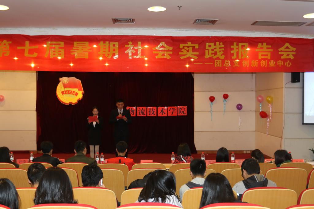 为积极响应校团委关于在校生暑期社会实践的活动要求,展示理学院学生暑期社会实践成果,物流技术学院于2017年10月31日晚在行政楼三楼报告厅召开了大学生暑期社会实践报告会。校团委副秘书杜俊、兄弟分院团总支副书记、物流团总支各部门干事及分院大一同学共同参加了此次活动。