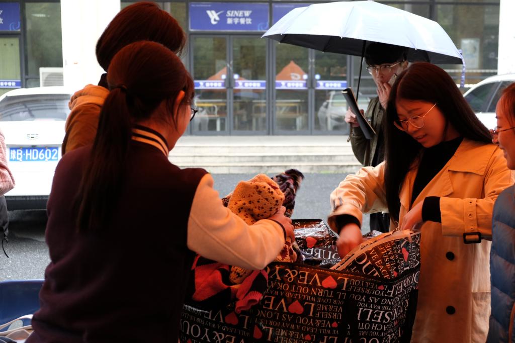 志愿者们耐心地为捐衣同学们讲解所捐衣物将邮寄给谁,如何登记所捐衣物,捐赠的衣物该如何存放?他们用自己的行动诠释了“奉献、友爱、互助、进步”的志愿者服务精神。下午15时,工作人员把募捐所得衣物整理好送至邮件寄发处,将装有衣物的麻袋一个个打包好,贴上快递单,寄送至贫困地区。一袋袋衣物,一张张快递单,一个个签名都包含着捐赠者对山区孩子的关爱,也在这个寒冷的冬天为孩子们送去许多温暖。