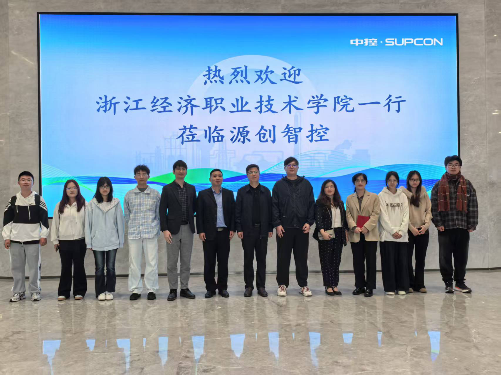 为深化校企合作、推动产教融合,拓展学生实习与就业渠道,2025年10月27日,浙江经济职业技术学院智能装备学院兼现代物流学院副院长俞志东、智能控制技术专业主任何川及专任教师吴响容带领大一新生代表,前往中控科技园浙江源创智控技术有限公司开展访企拓岗活动,并走访优秀校友、公司技术经理张海洋。