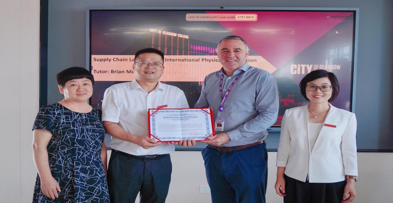 为扎实推进“双高计划”建设,深化中外合作办学内涵,促进开展境内外职教专家交流活动,学校聘请两名来自英国格拉斯哥城市学院的外籍教师——Danilo Rigliaco 与 Brian McEwan为我校客座教授,并于9月28日由现代物流学院领导班子成员颁发聘书。